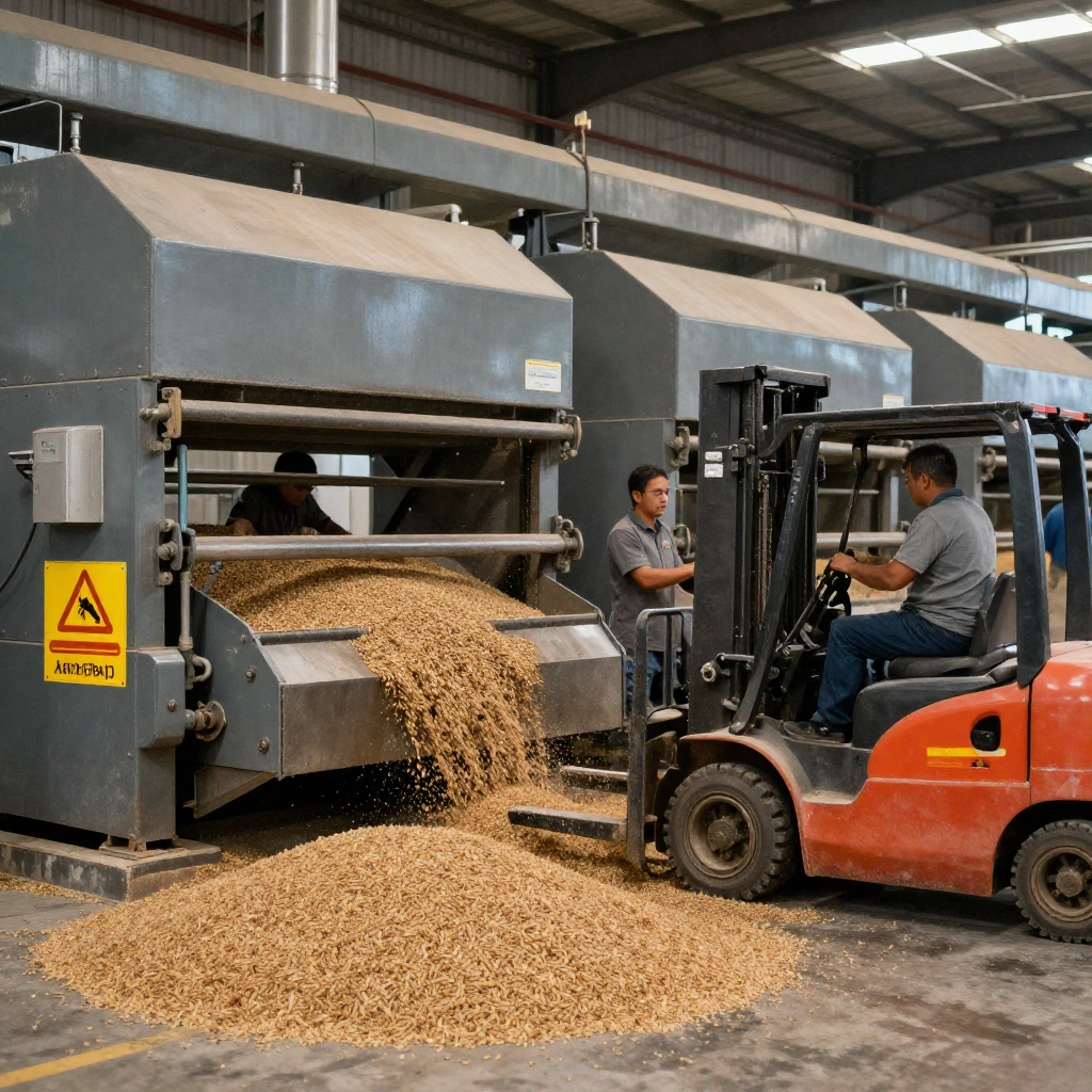 This large-scale dryer uses a rotating cylinder and high-temperature airflow to reduce biomass moisture for pelletizing. It ensures uniform drying and high thermal efficiency, preventing downstream clogs and maximizing production volume.