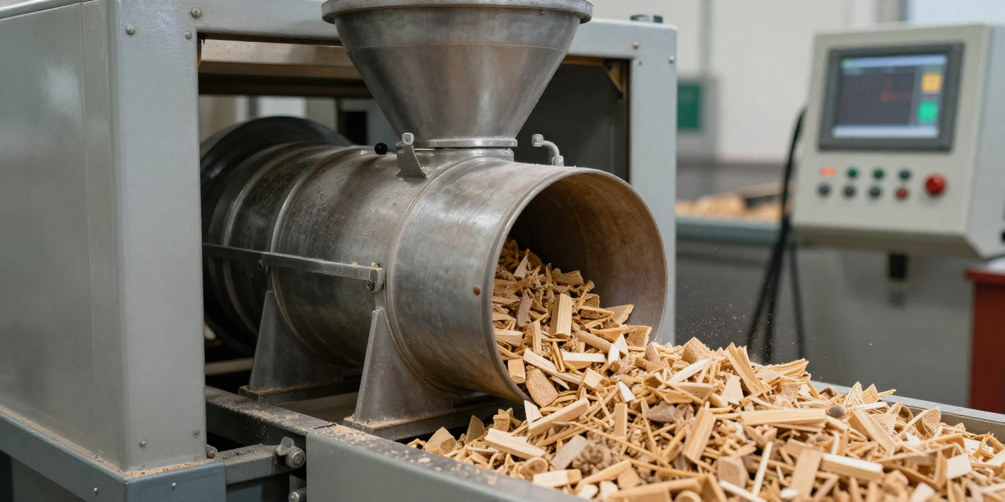 This industrial hammer mill grinds wood chips and biomass into fine, uniform powder (3–5mm). Its heavy-duty rotor ensures high-capacity throughput and consistent material quality for pellet production.
